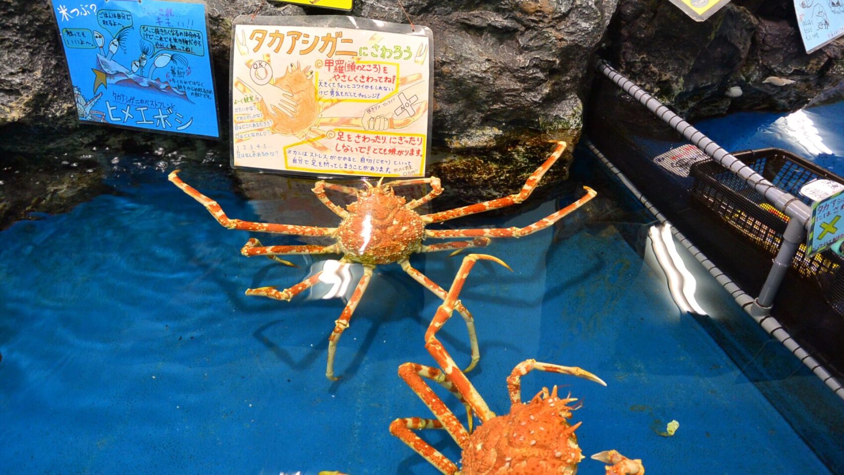 地元、蒲郡市の漁師さんが獲ってきたタカアシガニを展示しています。蒲郡産の魚が獲れたら水槽に追加していくのだそう!