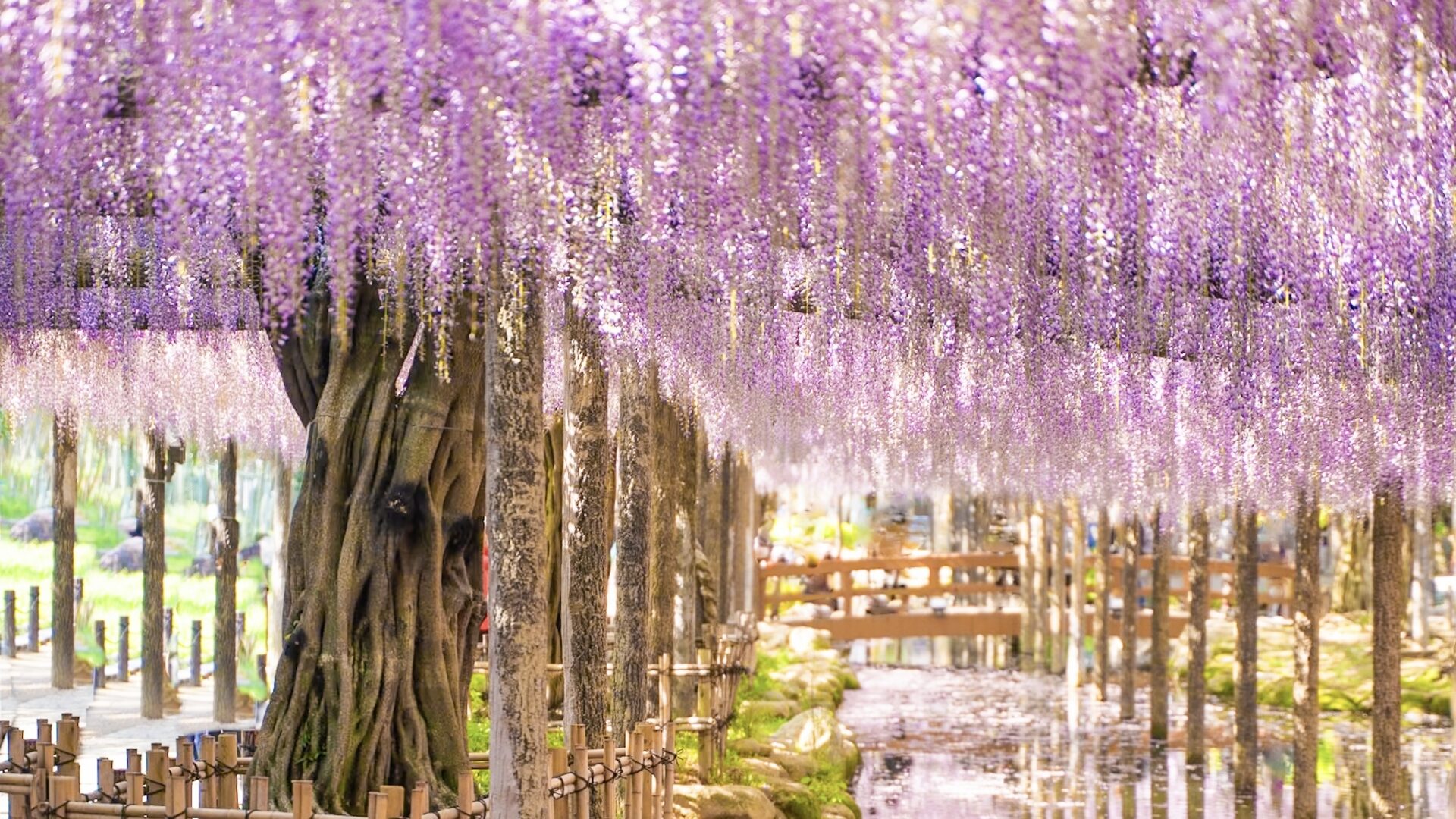1820年頃に、藤を愛する地元の住人が木や竹を用いてつくったのがはじまりとされる「広藤園」の藤棚。今なお、市民に親しまれている藤棚は、1,000㎡の敷地に1.5m以上あり、見頃になると一斉に鮮やかな藤色に染まります。