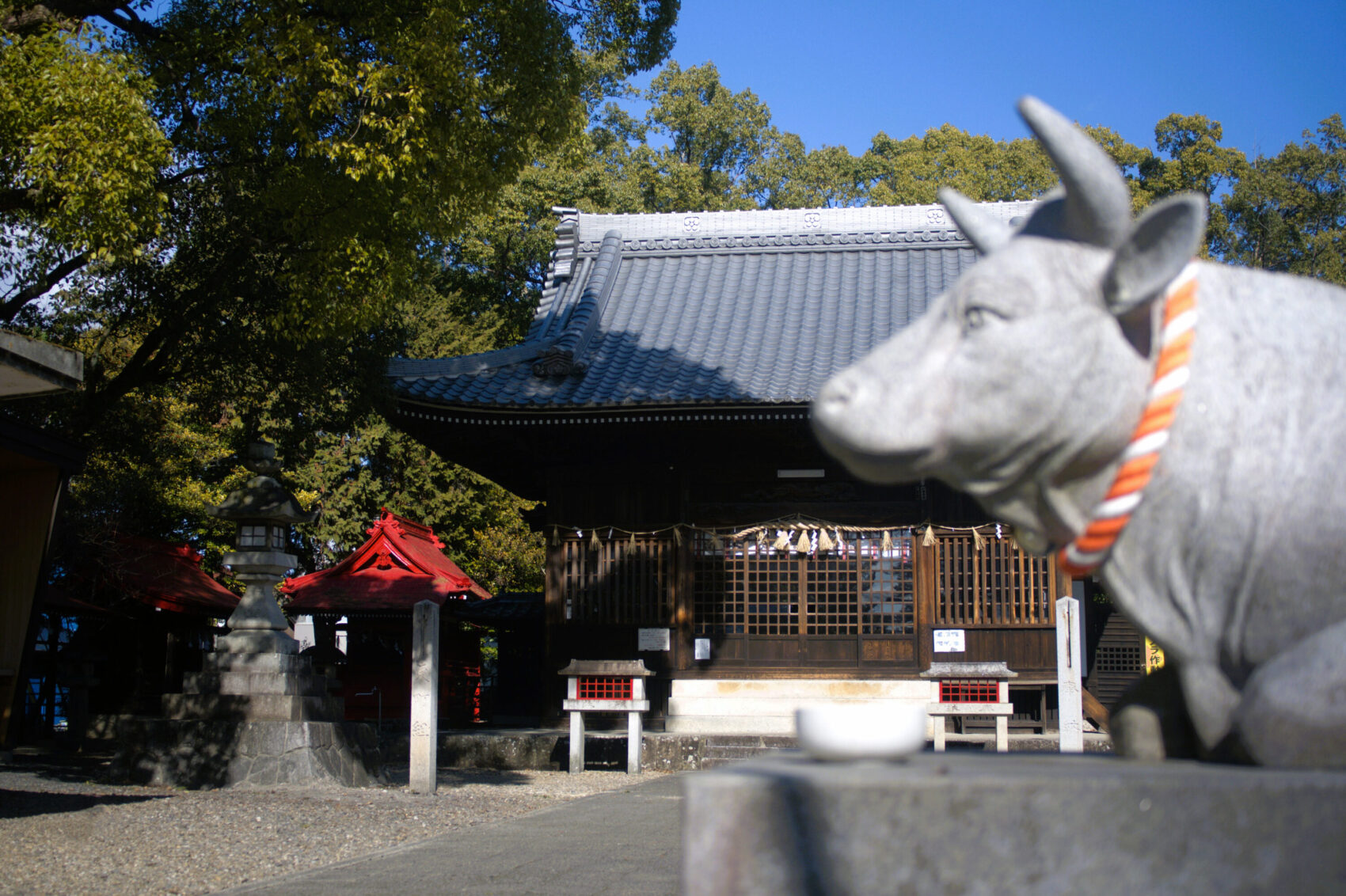 菅原道真公を祀る天満宮では、撫で牛がおかれていることが多いです。これは、菅原道真公の遺体を運んでいた牛車が座り込んで動かなくなった場所を安楽寺とし、それが太宰府天満宮になったという伝説によるもの。
