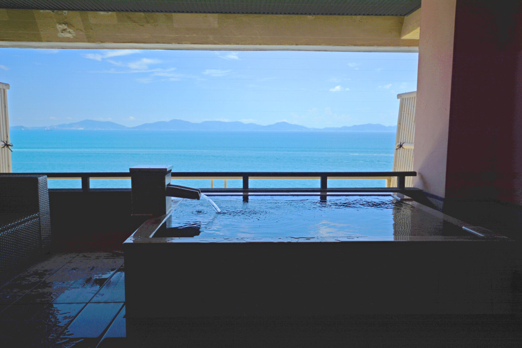 展望大浴場「風澄乃湯」(婦人)と「光彩乃湯」(殿方)からは、時間とともに移ろう海の表情と、水平線に沈む夕日、夜には漁火が煌めく幻想的な景色を楽しめます。貸切露天風呂も利用可能となっていますよ。