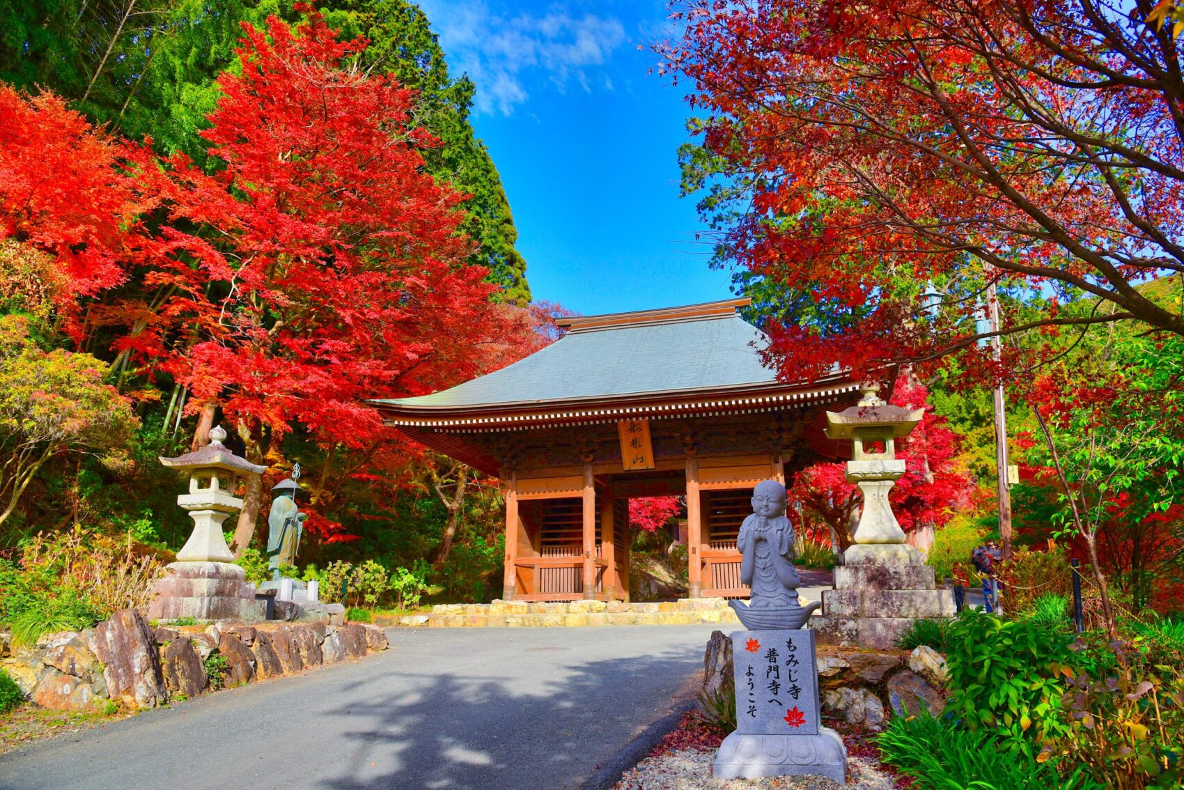 香嵐渓内にある曹洞宗の寺院「香積寺」も紅葉の見どころとしておすすめ。参道から山門までの間にもみじや杉木立が生い茂ります。