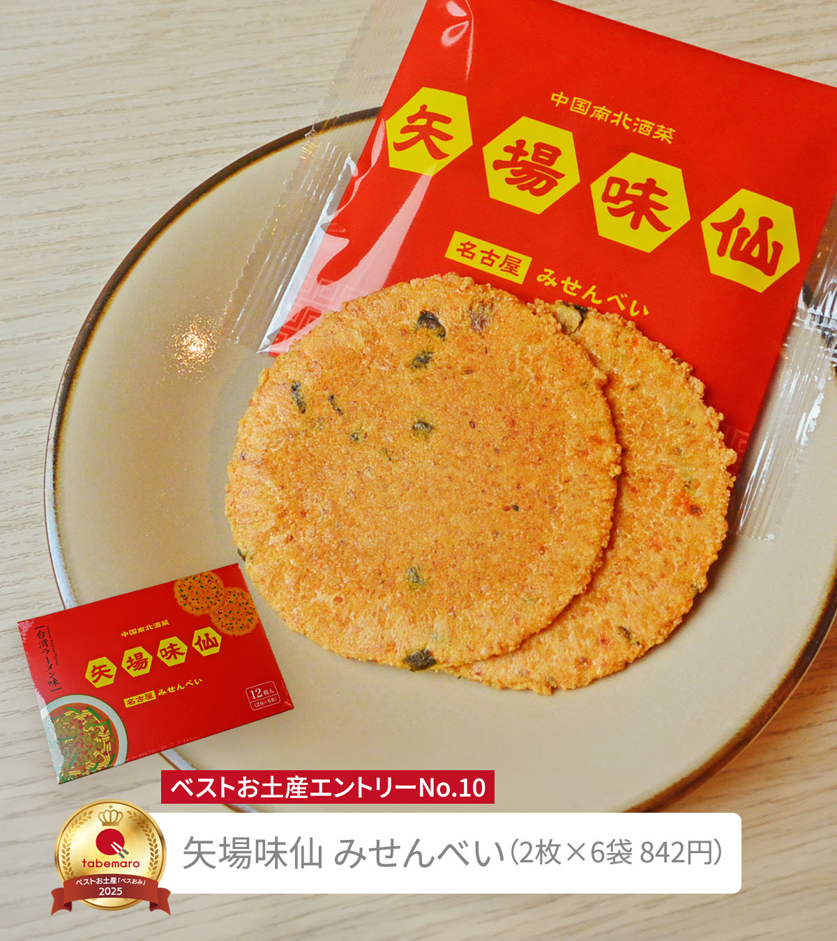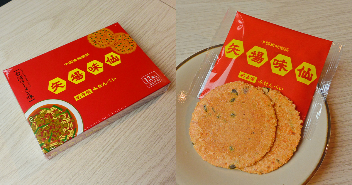 矢場味仙の台湾ラーメン風味を、せんべいに落とし込んだ話題みやげ。博多土産『めんべい』で有名な山口油屋福太郎とのコラボ商品となっており、ピリ辛で間違いないおつまみ向きの一品。軽く持ち帰れて配りやすいのも魅力です。