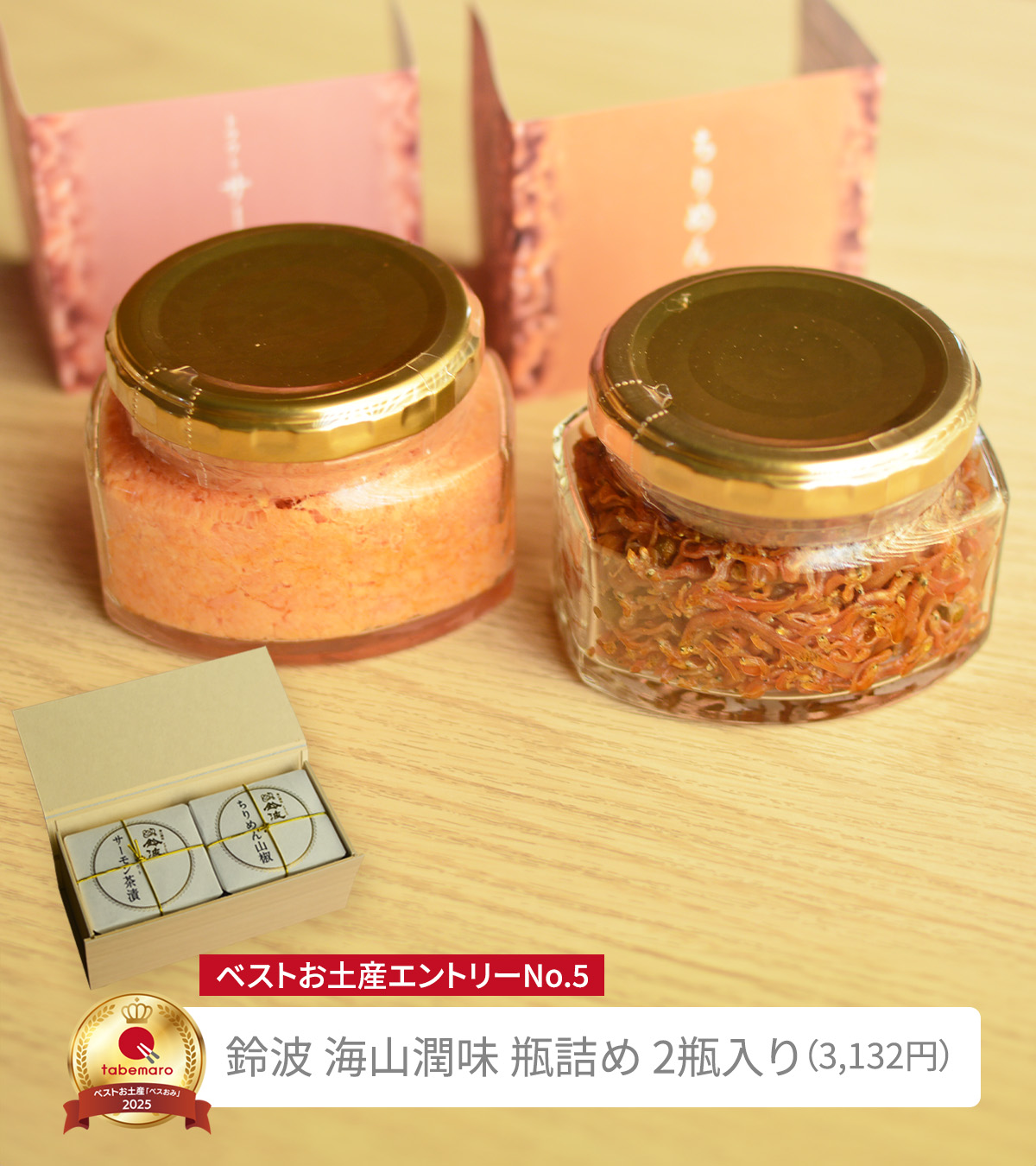 名古屋の老舗「鈴波」が作る、上品な味付けの瓶詰め詰合せ。ご飯のお供にもお酒にも合い、きちんと感のある名古屋みやげになります。瓶詰めは「トラウトサーモン茶漬け」「丹波黒豆」「鯛茶漬け」「ちりめん山椒」などバリエーションも豊富。
