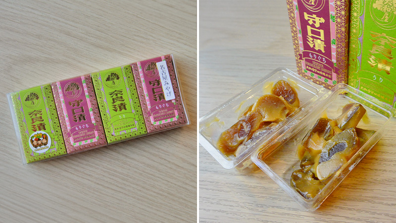 尾張の伝統漬物「守口漬」で知られる老舗・大和屋守口漬総本家の「守口漬」「奈良漬」の詰め合わせ。お茶碗一杯分の小分けになっているのがお土産として渡しやすいポイントです。