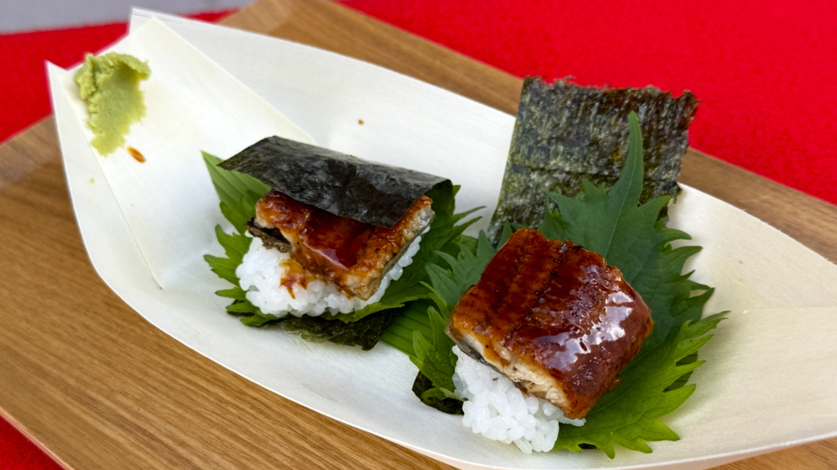 おすすめは 手軽にうなぎが味わえる手まり寿司「うなむす」。薬味もついてきて、ひと口で食べられるひつまぶし、といった一品。山椒や醤油は店頭にあるのでお好みで追加してみて。