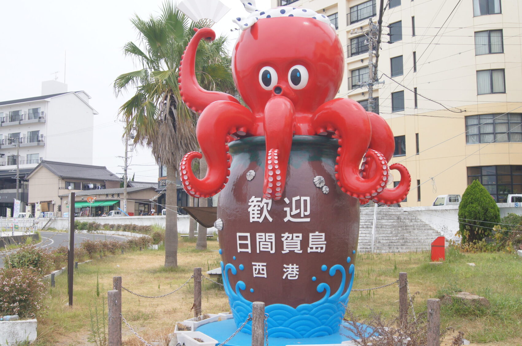 港に着くとまず出迎えてくれるのが、巨大なタコのモニュメントです。西港にいるのが右手を上げた「にっしー」、東港にいるのが左手を上げた「がっしー」。2体合わせて「多幸(タコ)」を招くといわれているので、ぜひ両方と記念撮影してみて。