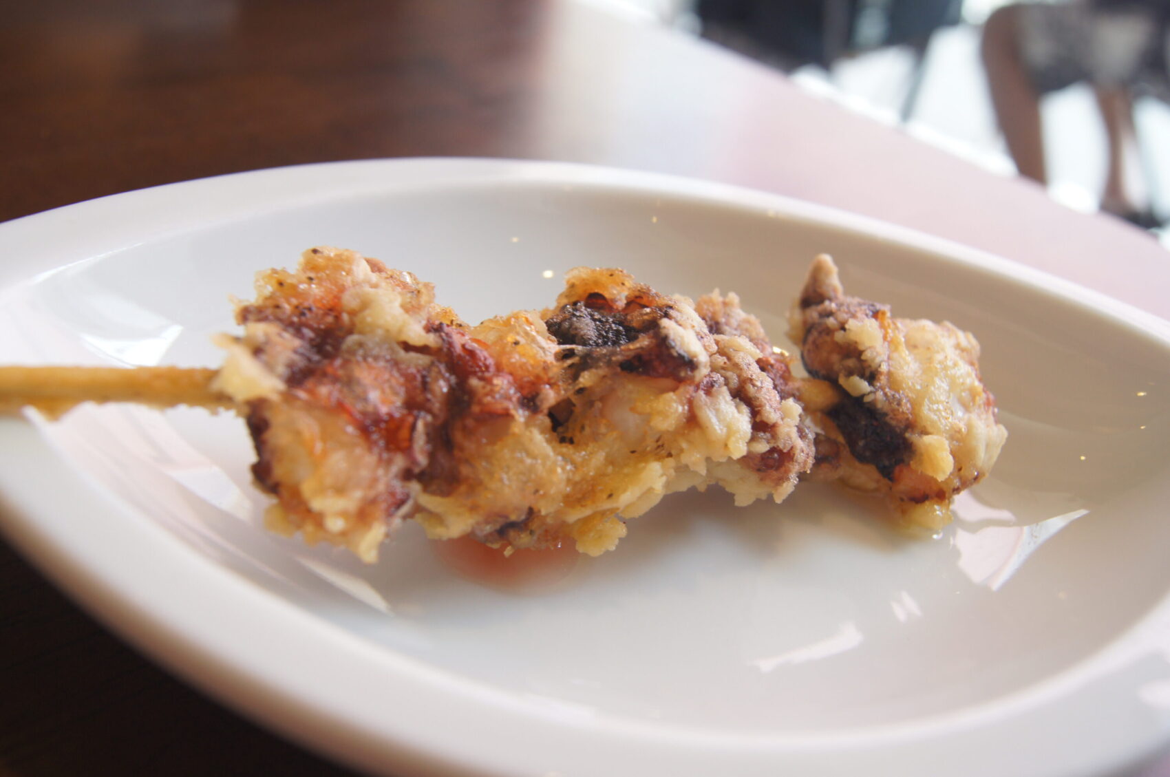 串に刺さった「タコの唐揚げ」は、ジューシーで旨みが強く、一度食べたら止まらなくなる美味しさです。ビールとの相性も抜群なので、海を眺めながら一杯楽しむのも贅沢な過ごし方ですね。