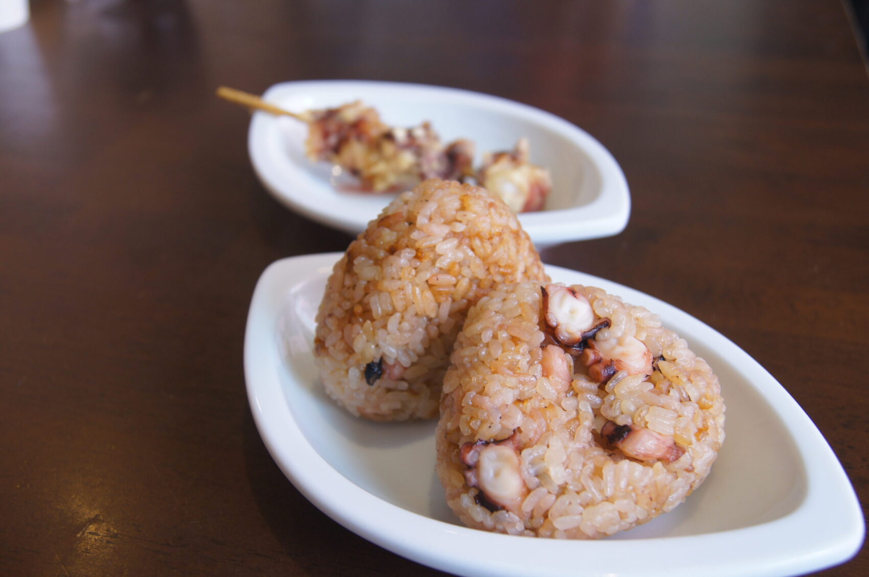 名物のたこ飯をぎゅっと握ったおにぎりは、食べ歩きや帰りの船を待つ間の小腹満たしに重宝します。手軽に食べられるサイズ感ながら、タコの存在感はバッチリ!