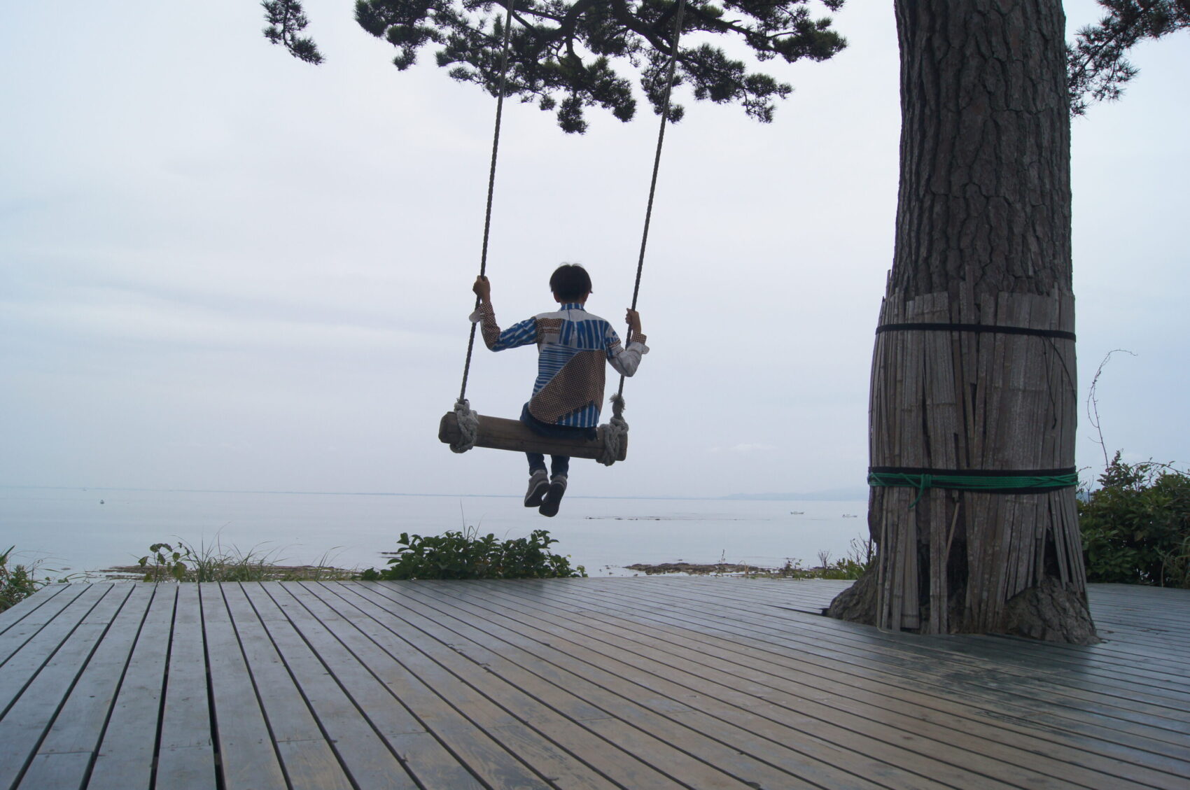 島の東端にある「恋人のブランコ」は、日間賀島観光の代名詞。高台に設置された大きな木製ブランコを漕ぎ出すと、目の前には青い海と空がどこまでも広がります!