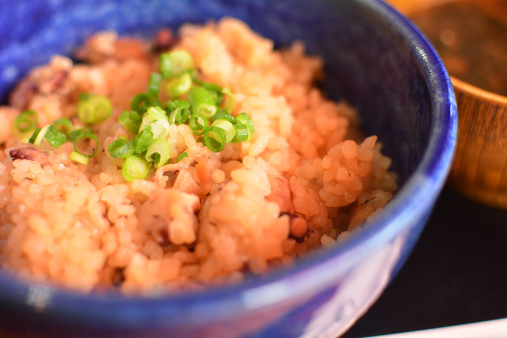 名物の「たこめし」は、タコの旨みがぎゅっと凝縮されていて絶品です!他にも新鮮なお刺身定食など、島の恵みをダイレクトに味わえますよ。