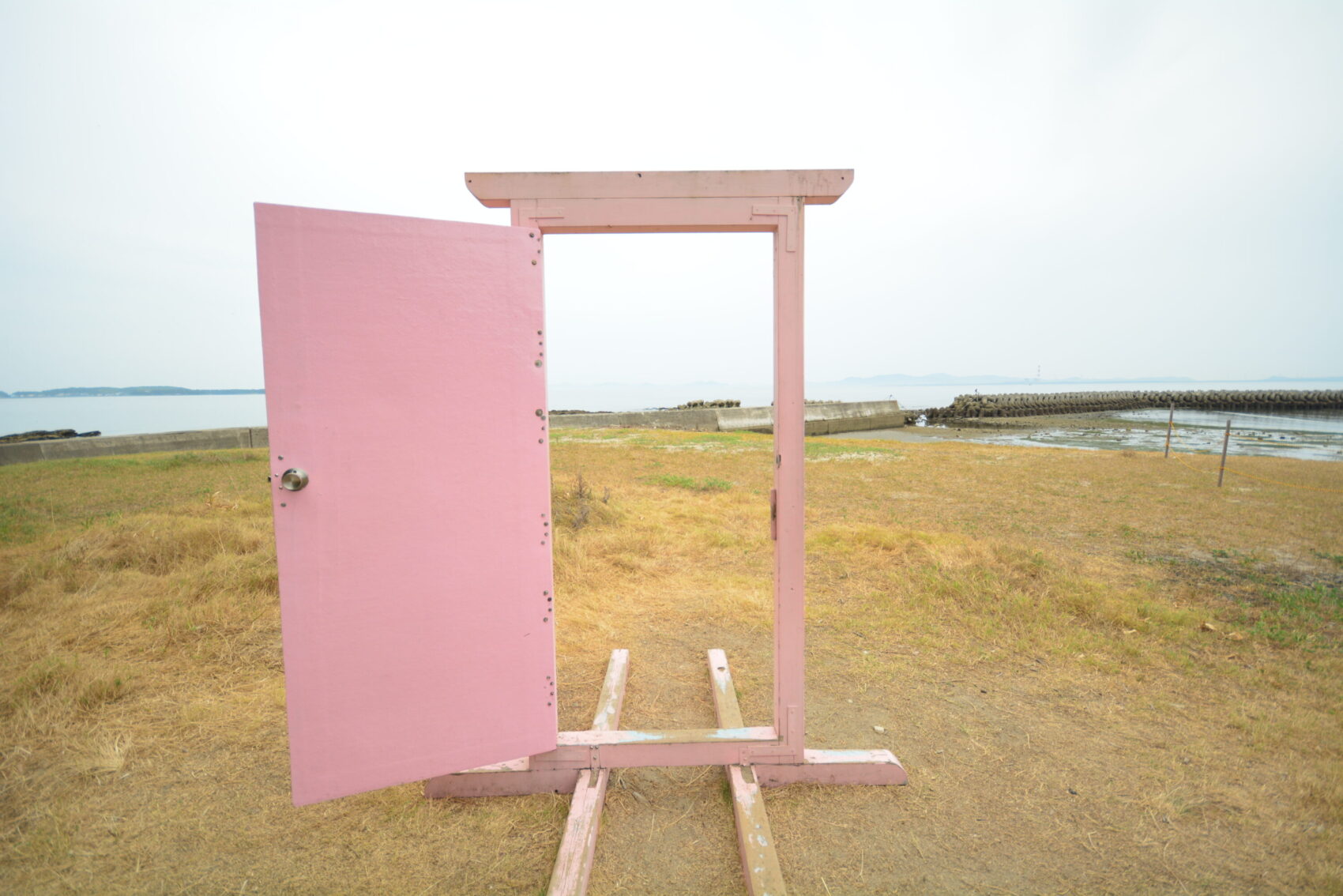 注目は、砂浜にぽつんと置かれたピンク色の「どこでもドア」!ドアを開けると目の前には真っ青な海が広がり、まるで異世界へ繋がっているような不思議で可愛い写真が撮れますよ。