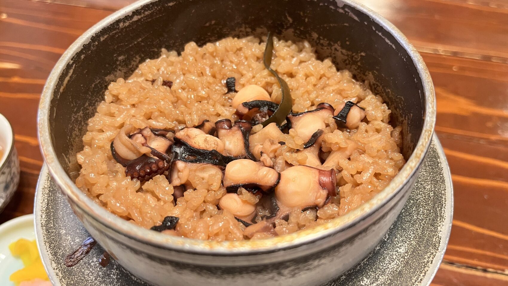 「たいかいろう東店」で、絶対に外せないのが、注文ごとに一釜ずつ丁寧に炊き上げる「たこ釜めし」です。