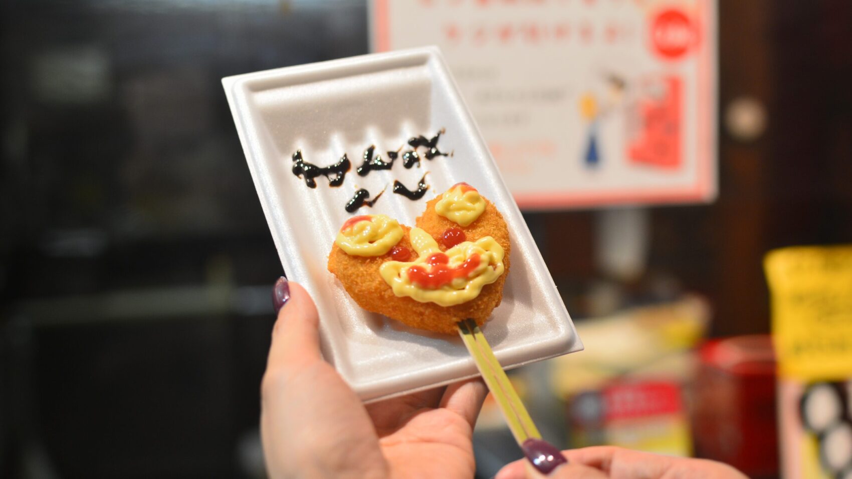 恋みくじがついてくる「恋もコロッケ」はハートの形をしていて可愛いのがポイント。一緒にもらえるケチャップ・マヨネーズ・チョコシロップでお絵かきできます。見本があるのでご心配なく!