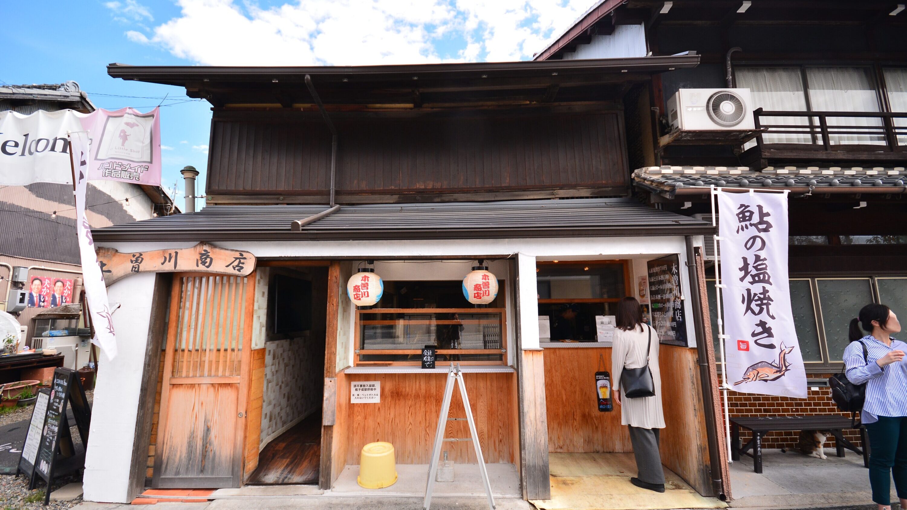 城下町の郷土料理店「木曽川商店」では、その場で炭火焼きをしたアユの塩焼きが年中いただけます。イートインスペースやベンチが設置されており、ゆっくりひと休みも可能。