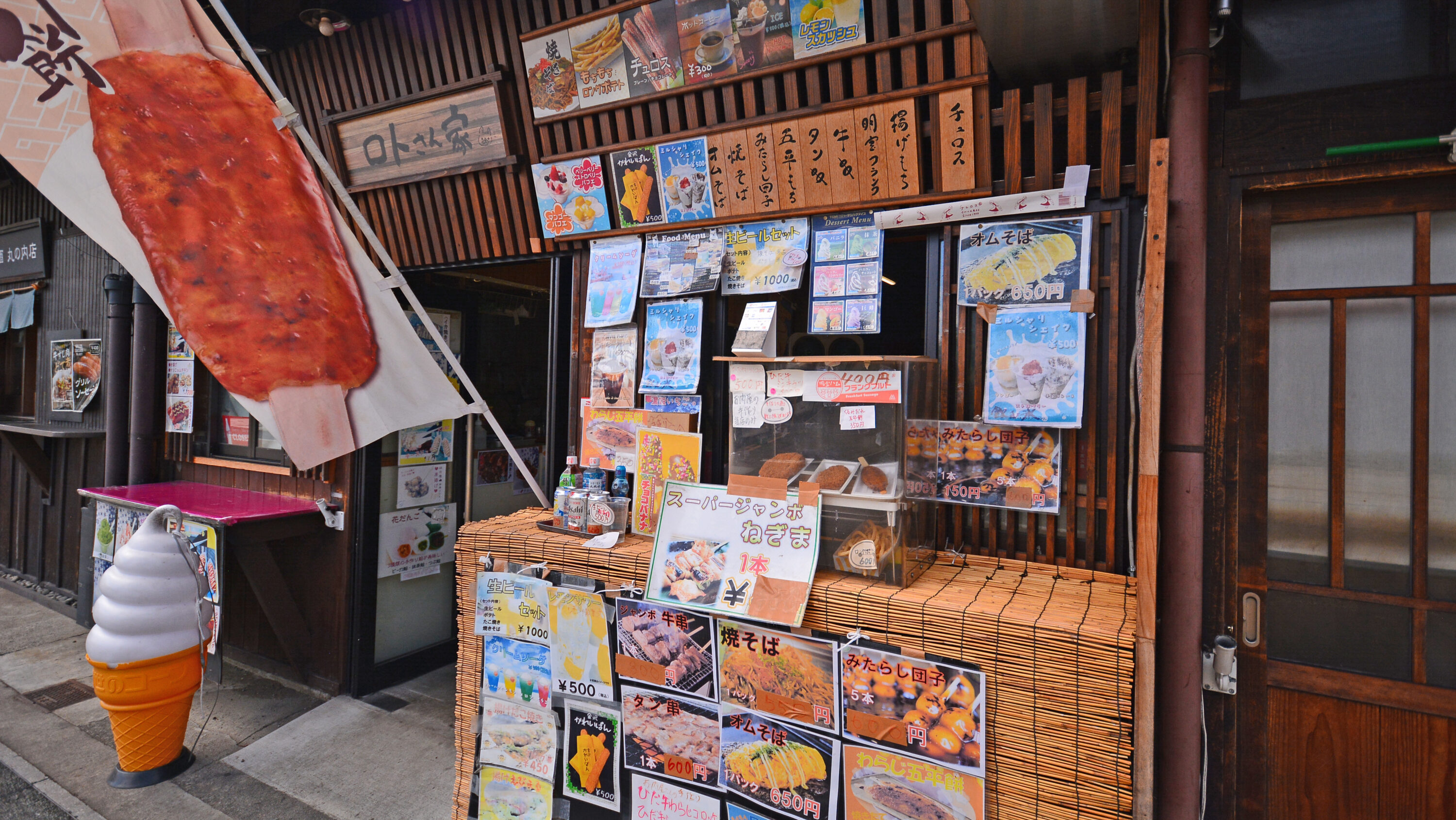 犬山駅から西に歩き、本町交差点を右に曲がって城下町を少し行くと、レトロな雰囲気を醸す「昭和横町」が現れます。中に入ると昭和の趣を残した空間が広がり、ここにも食べ歩きが楽しめる店舗が続きます。
