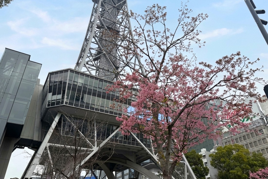 栄にある名古屋のシンボル、中部電力MIRAI TOWER(名古屋テレビ塔)。タワーの足元には何本か河津桜が植えられており、3月上旬ごろになるといっせいに開花し、行きかう人を癒します。