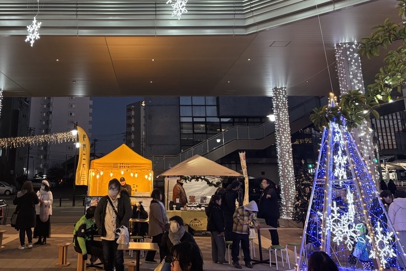 2025年は市制施行75周年の節目の年。12月13日(土)にはクリスマスマーケットも開催され、温かいフードやドリンク、雑貨のブースが並びます。駅を降りた瞬間から続く光の回廊とマーケットのにぎわいが合わさり、記念イヤーならではの特別な夜を演出してくれます。