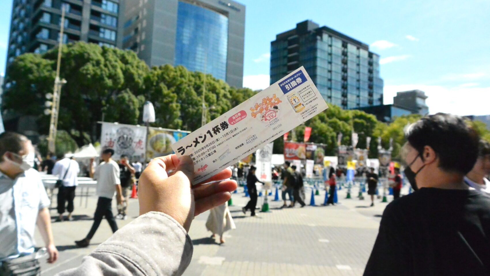 イベントへの入場は無料ですが、ラーメンを食べるには「ラ~メン券」が必要です。グルメやドリンク、グッズは当日会場で別途購入できます。