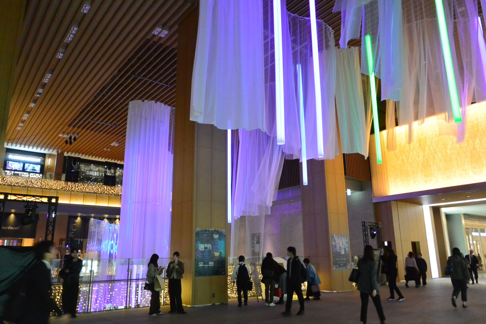 1階アトリウムから2階部分まで、全長約25mにわたって広がるオーロラのようなライティングと、約2万球のLEDが生み出す光のカーテンは圧巻。音楽に合わせて光が変化するショー演出もあり、まるで音が色になって目の前に現れるような体験型のイルミネーションが楽しめます。