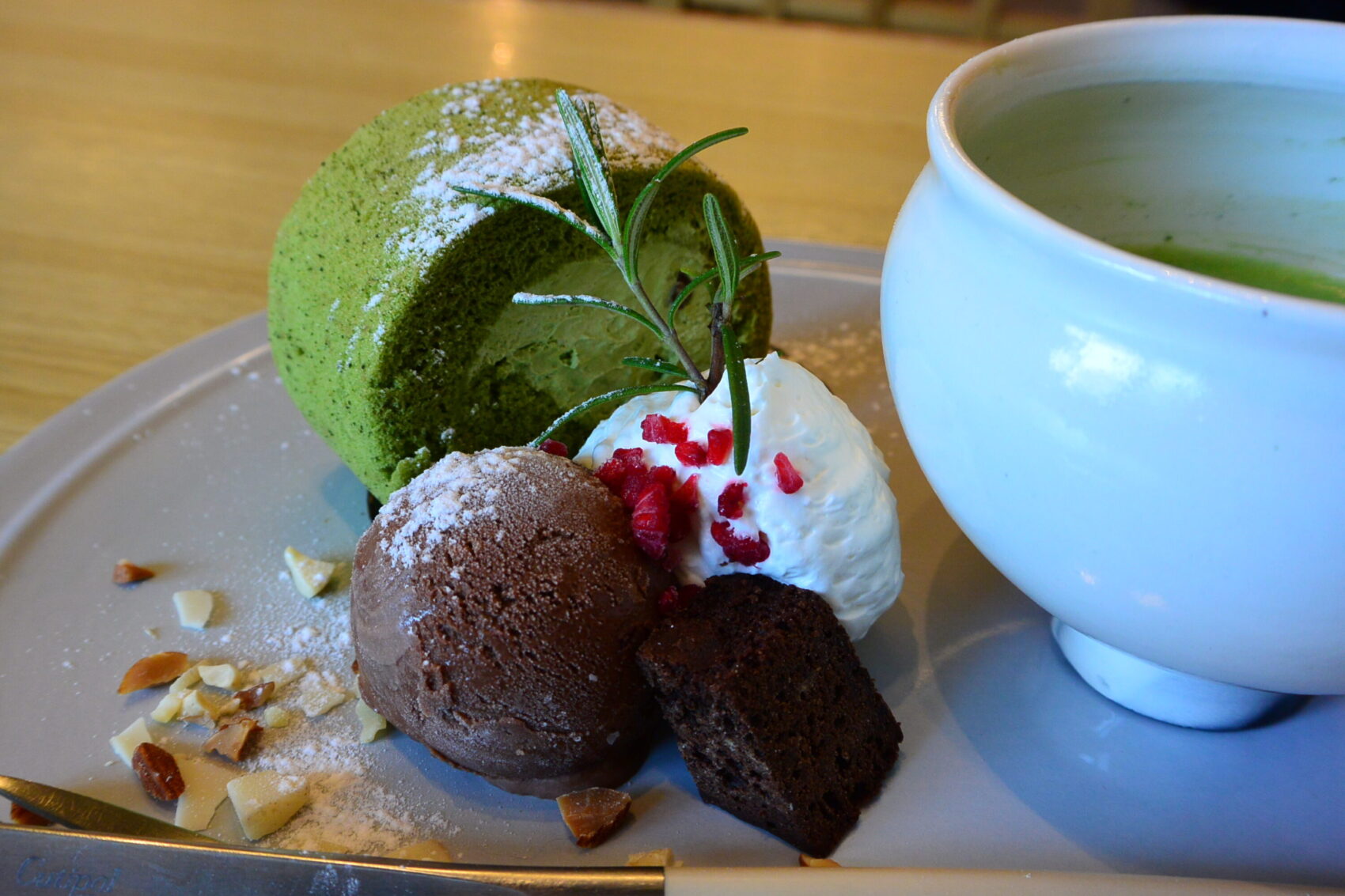農家直送の新鮮な西尾抹茶を使った抹茶ラテと一緒に、贅沢なティータイムを過ごしてみて。