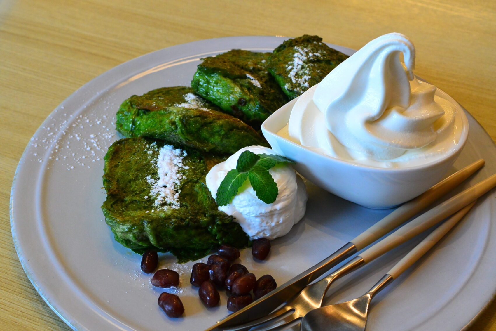 ここでぜひ味わってほしいのが、見た目のインパクトも抜群な「抹茶フレンチトースト」!厚切りのパンに、これでもかというほど濃厚な抹茶のアパレイユが芯まで染み込んでいて、一口食べればお口の中が抹茶の幸せで満たされます。外はカリッと、中はとろけるような食感で、添えられた冷たいアイスやクリームと一緒にいただけば、温かさと冷たさのコントラストがもう最高。