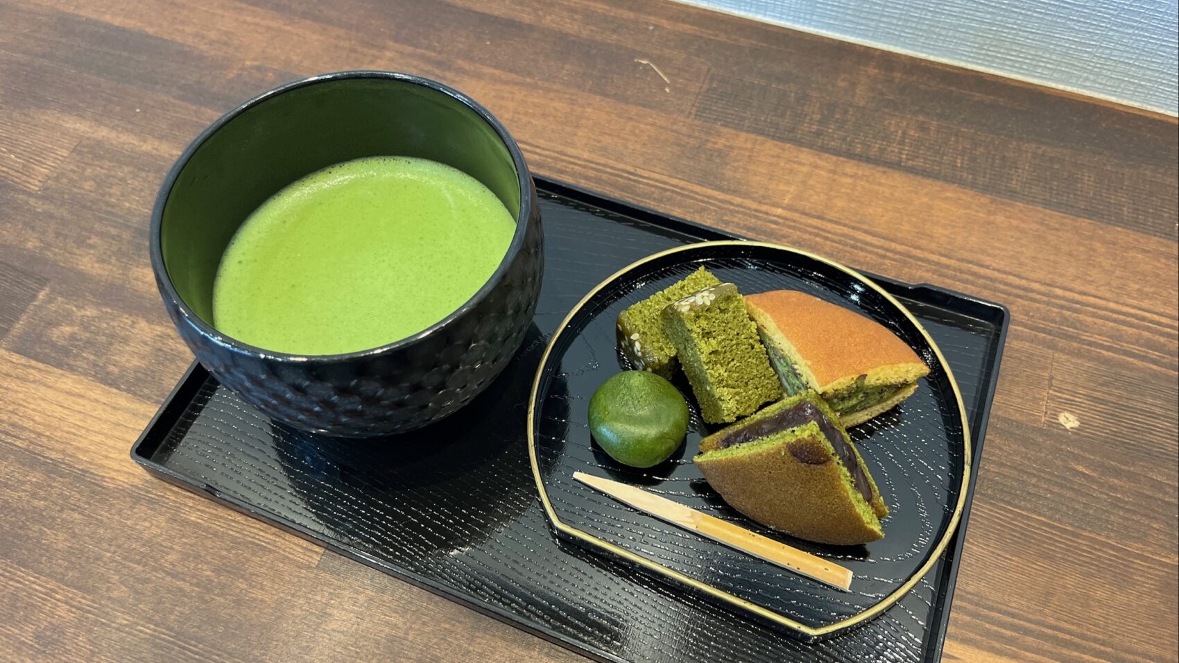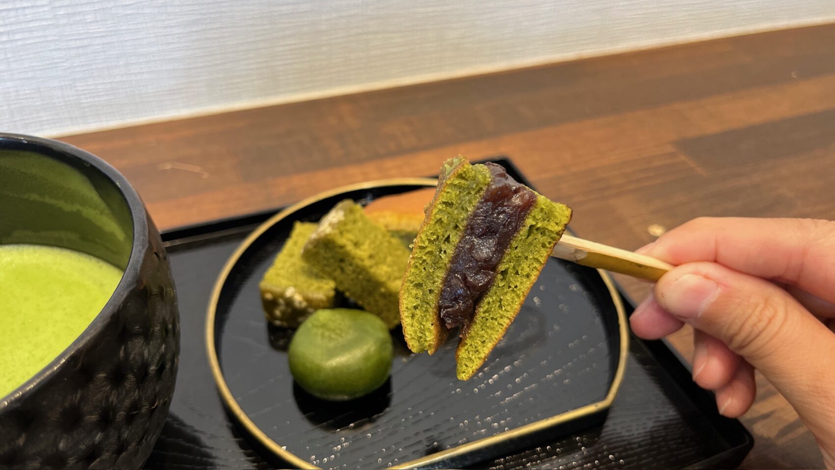 セットに添えられた「抹茶どら焼き」も絶品。しっとりとした生地の間には、抹茶の風味がぎゅっと凝縮された餡が丁寧に挟まれていて、一口食べるとお茶の爽やかな香りがふわっと広がります。上品な甘さが、お抹茶の心地よい苦みをメチャクチャ引き立ててくれる名コンビです!