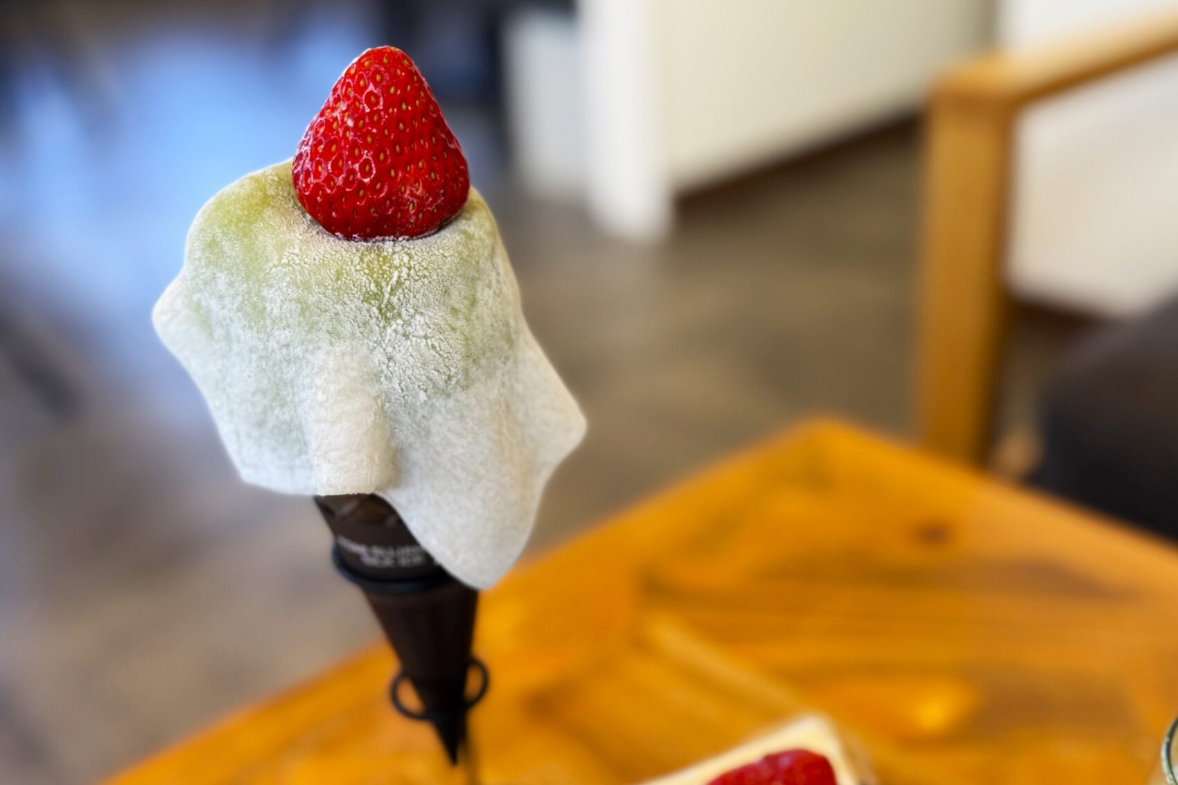 ここで絶対に食べておきたいのが、季節感たっぷりの「いちご大福パフェ」。濃厚な抹茶ソフトクリームの上に、真っ赤なイチゴとモチモチの求肥が乗った、まるで宝石箱のようなビジュアルに心が躍ります。抹茶のほろ苦さと、イチゴの甘酸っぱさが重なる瞬間はまさに至福!