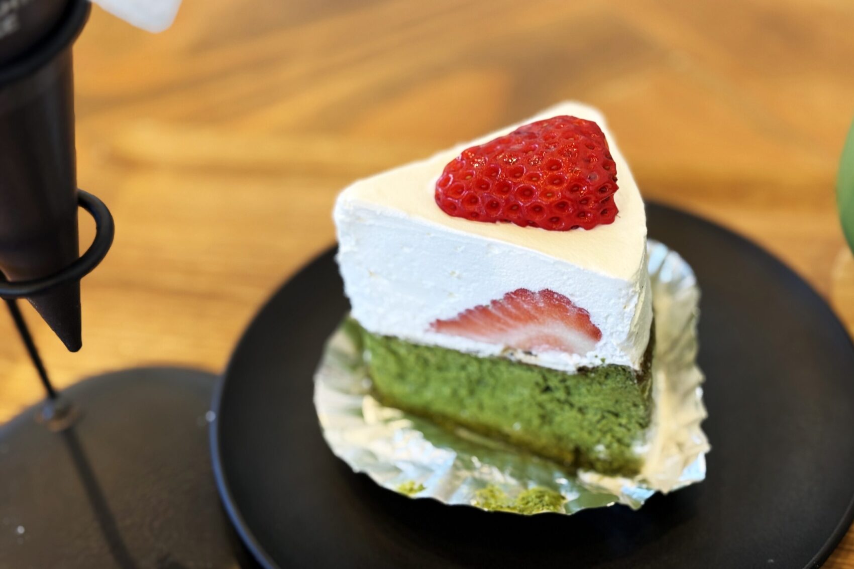 さらに、しっとり濃厚な「抹茶バスクチーズケーキ」も外せません。冬から春にかけて、フレッシュなイチゴが添えられた特別仕様で登場。チーズのコクと抹茶の深い香りが溶け合うケーキに、イチゴのみずみずしさが最高のアクセントになっています。