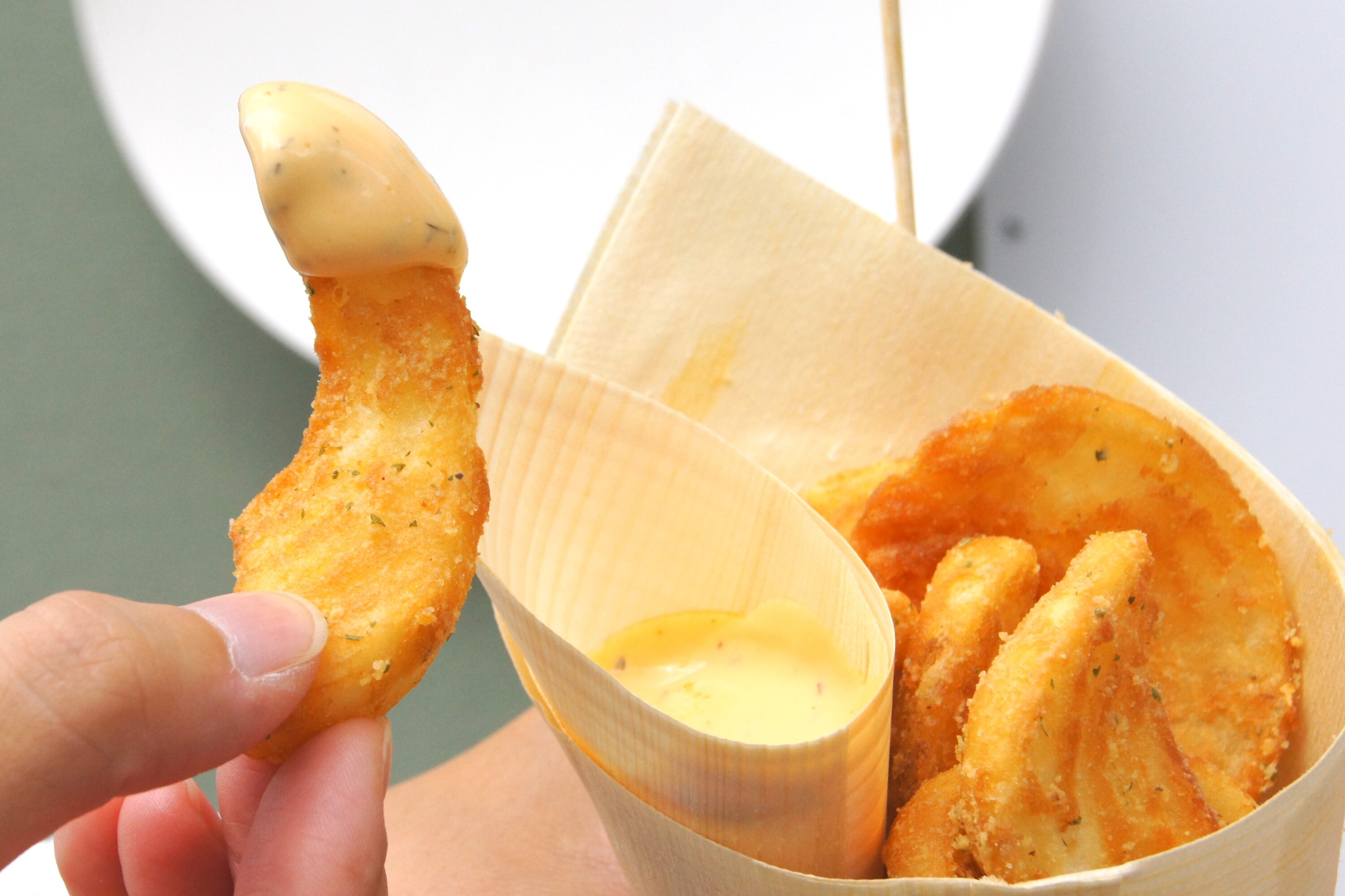 ポテトは揚げたてを食べ歩きできるワンハンドフードスタイルで楽しめるスタイル。手順としては、まず①ポテトの種類を6種類から選ぶ→②スパイスを5種類から選ぶ→③ディップソースを選ぶ、となっています。
