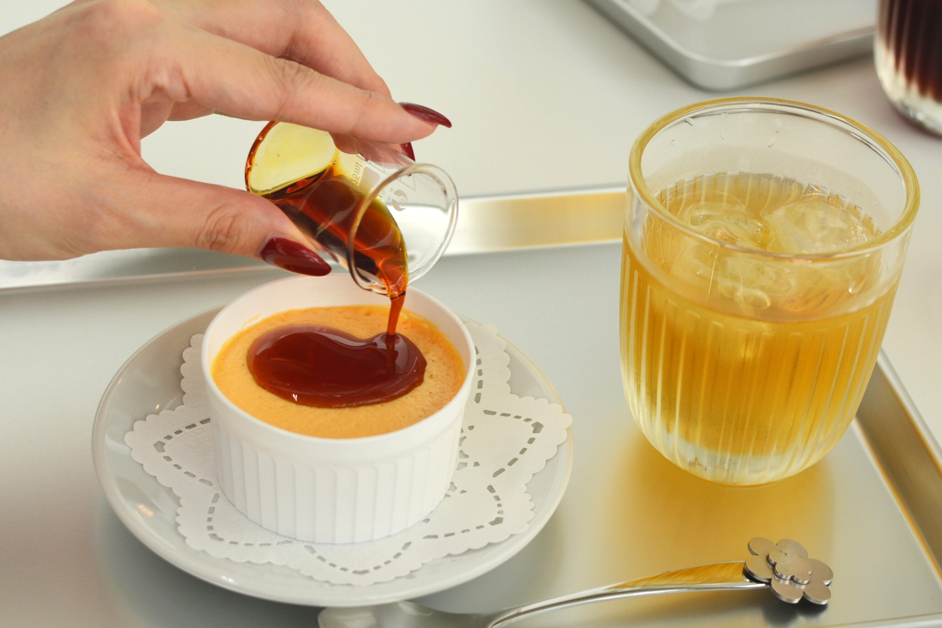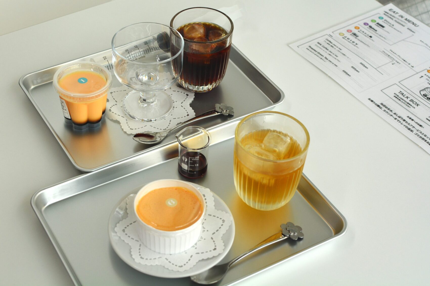 カラメルがビーカーのような容器に入っていたり、注射器でプリンに空気を送り込んだり、まさにラボのような雰囲気。テイクアウトでも可能ですが、イートインで雰囲気を味わうのもおすすめ。