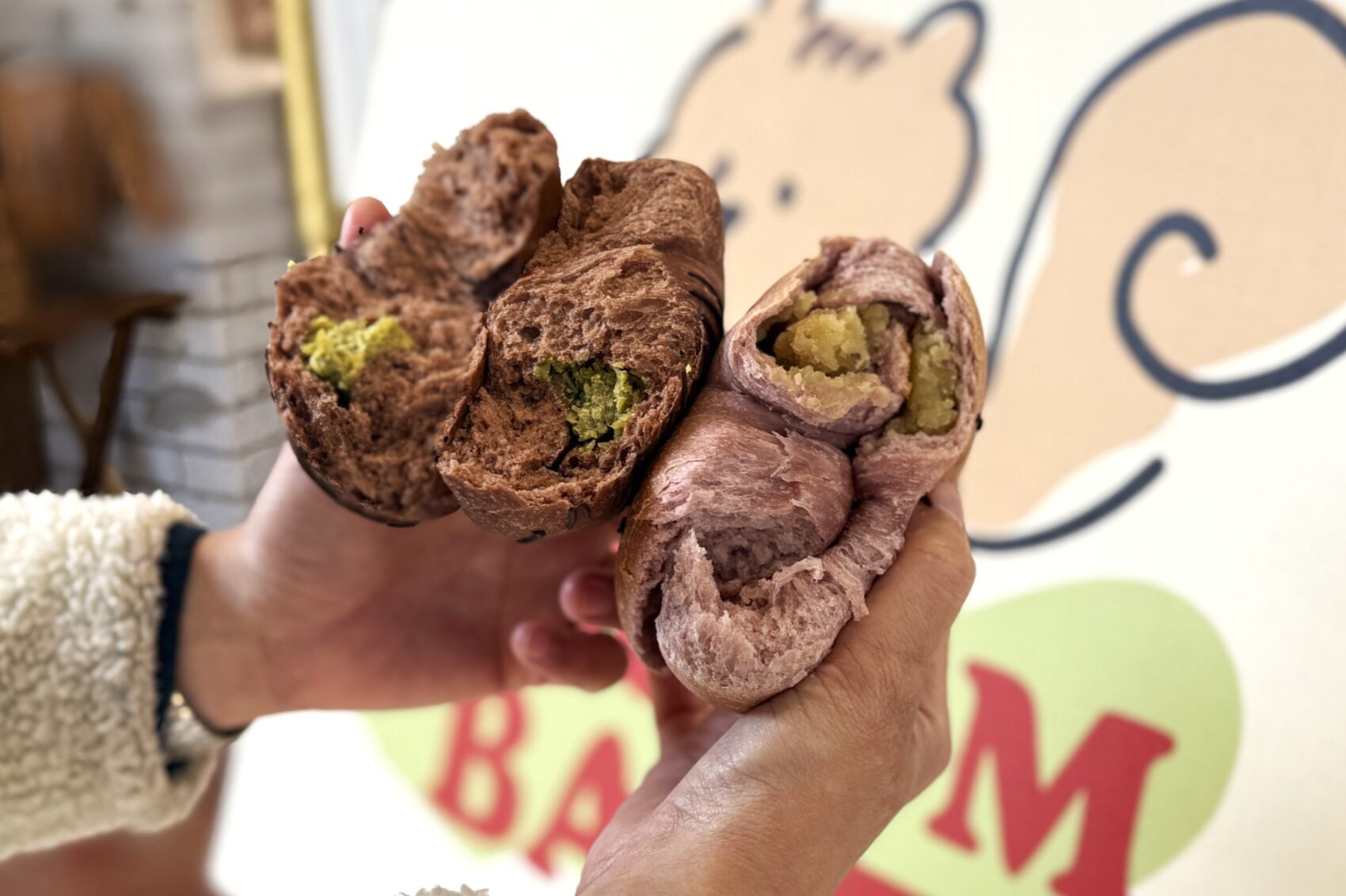 壁に描かれた「バターマン」をバックに、クレープを手に持って写真をパシャリ。「賞味期限5分」なので、熱いうちに召し上がれ。