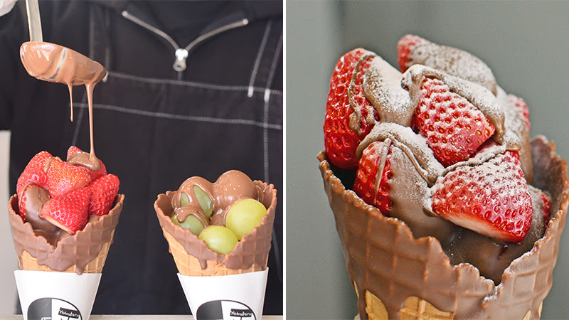 目の前でとろ~りチョコレートでコーティングされたフルーツはパリパリジューシーでたまらない!写真映えも満点の一品です!