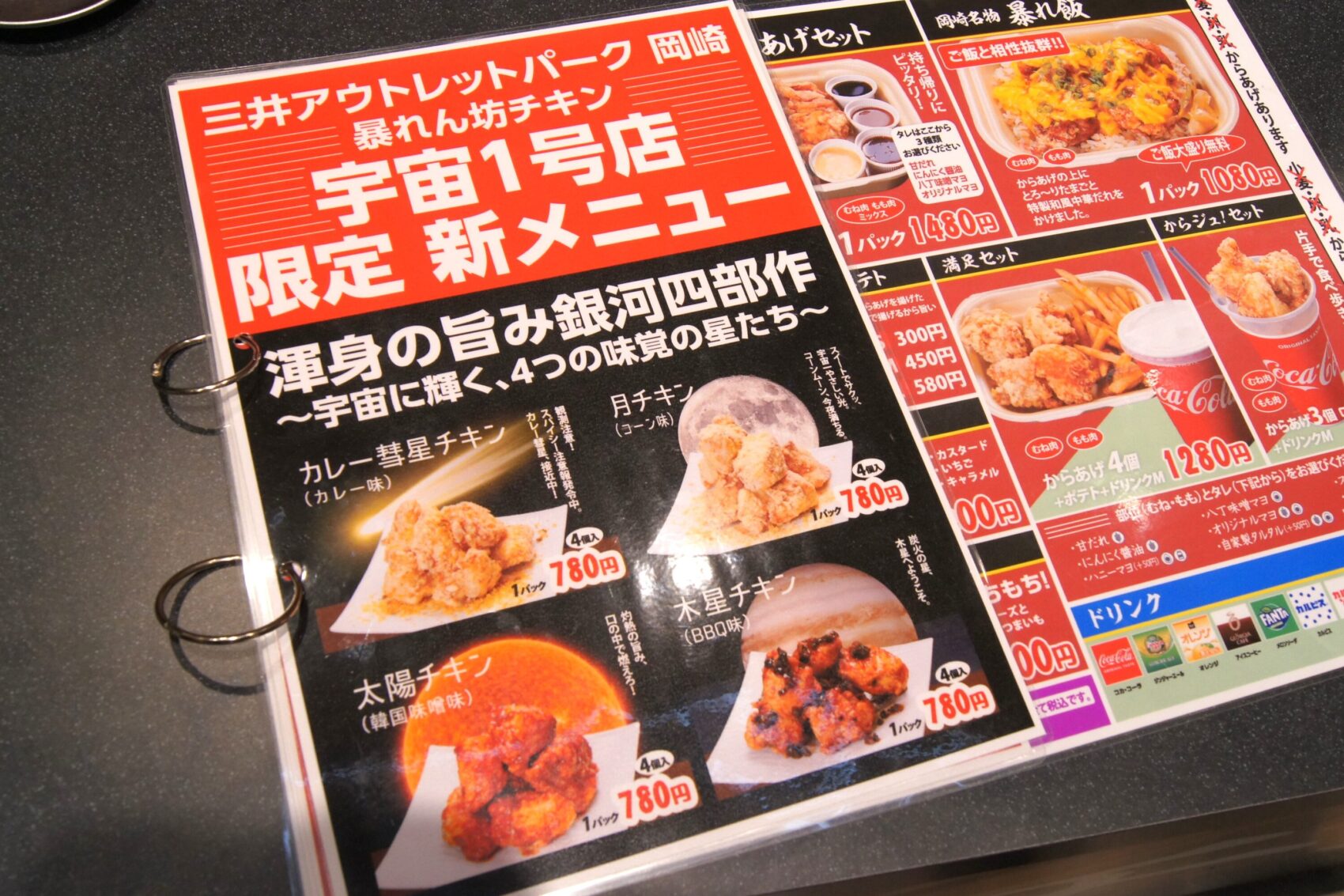 「からあげグランプリ」で最高金賞を受賞したこともある、岡崎市の人気からあげ専門店「暴れん坊チキン」も商業施設初出店。「岡崎から愛知、愛知から日本、日本から世界、世界から宇宙へ」というスケールの大きいコンセプトを掲げる「宇宙1号店」として出店しています。