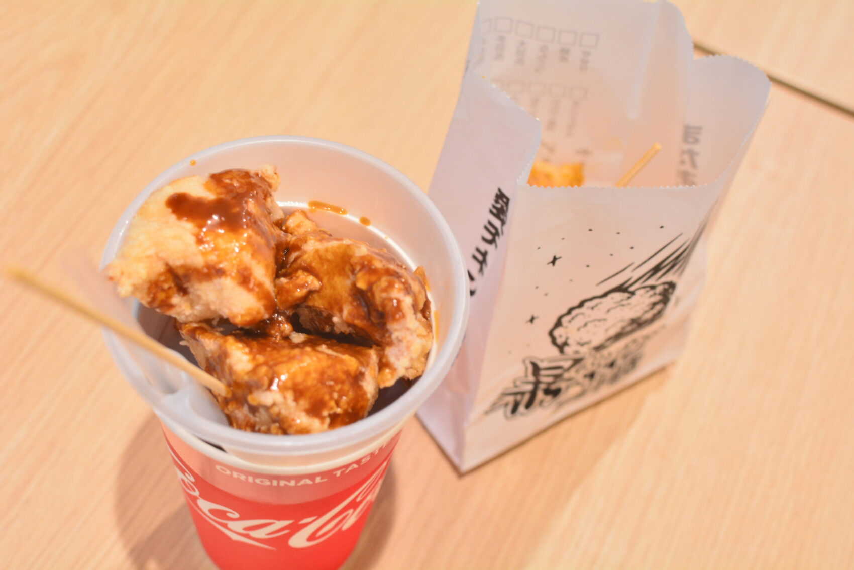 食べ歩きにぴったりなのは、セットドリンクの上にからあげがのった「むねからジュ!セット」。からあげ片手にアウトレットでショッピングを楽しむのもおすすめです。