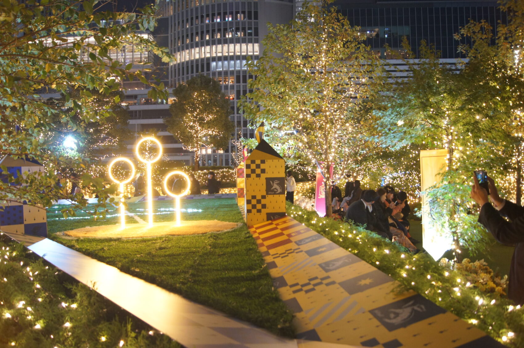 会場の中央部分には、映画ファンにはお馴染みの魔法界の人気スポーツ「クィディッチ」の競技場をイメージした装飾が施されています。4つの寮をモチーフに、フィールドではLEDイルミネーションで金のスニッチを表現しており、魔法にかかったかのような幻想的な空間を演出します。