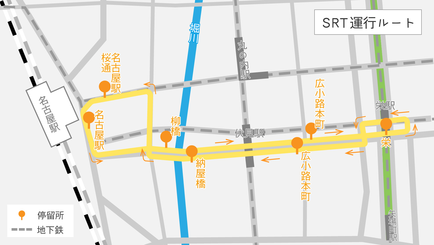 A. 名古屋駅〜栄エリアを結ぶ「東西ルート」で、7つの停留所を巡回します。