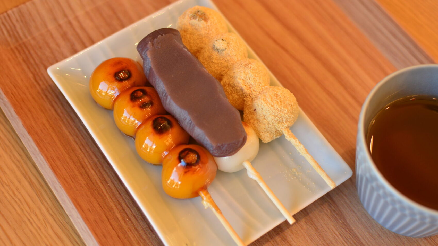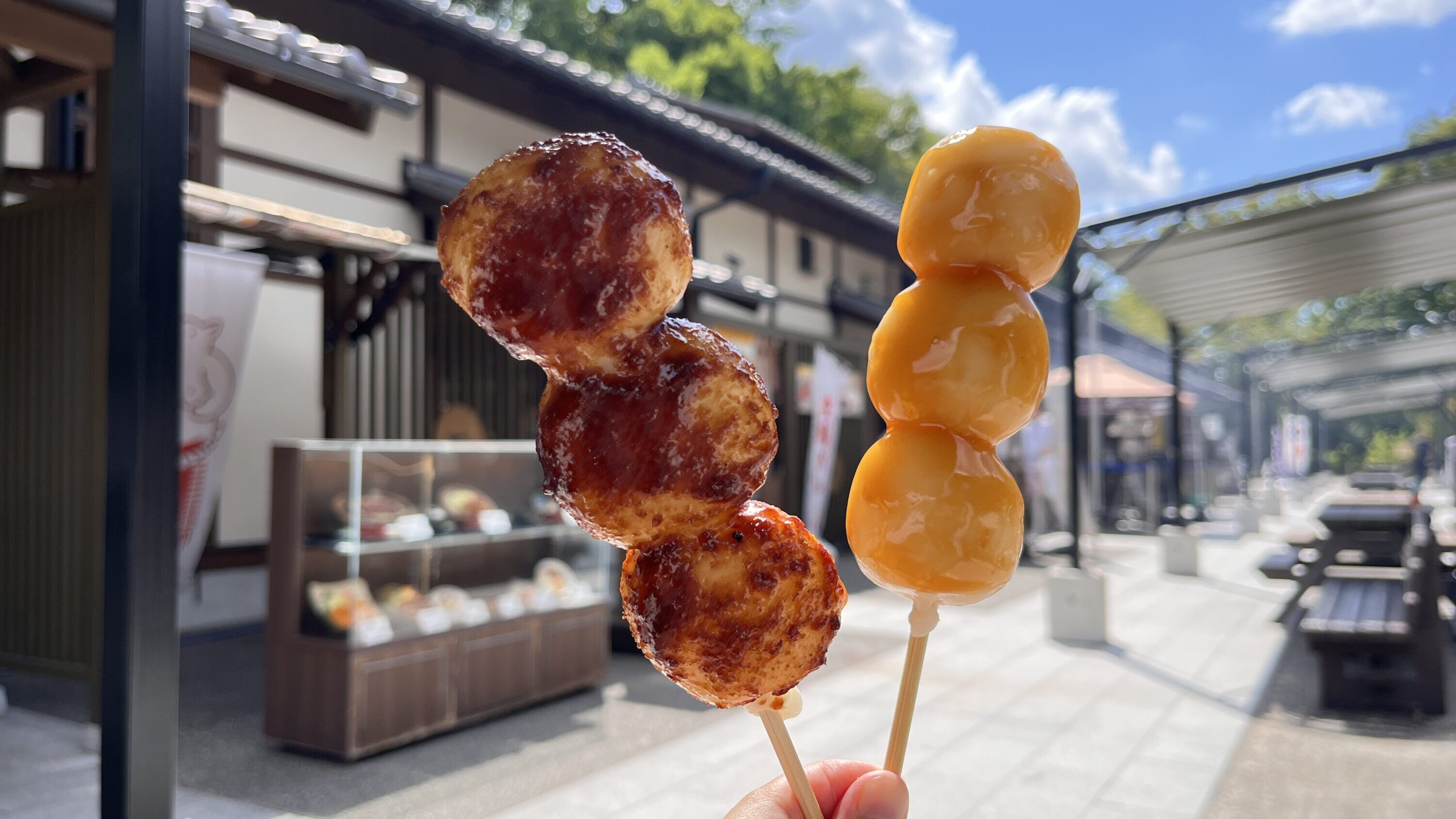 犬山城下町の特徴は、「串グルメのまち」として知られる点です。五平餅、団子、串カツ、飛騨牛串など、あらゆるものが串に刺さって提供されており、食べ歩きに最適。カラフルな団子やフルーツ飴などSNS映えするグルメも多く、人気を集めています。
