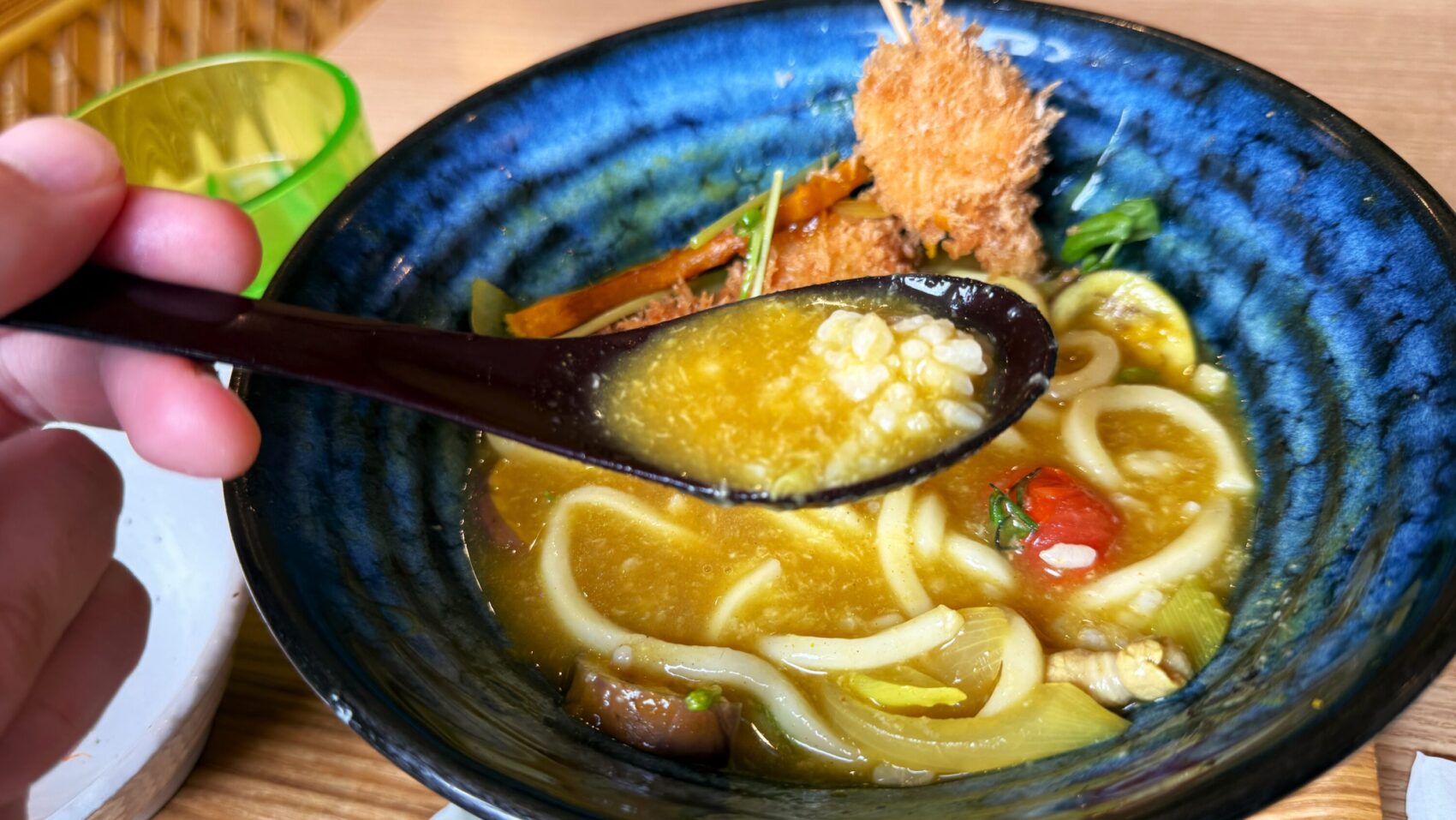 うどんの中にとろろが潜んでいるので、とろみをプラスしたい場合は先に混ぜてしまうのも◎。ごはんも麺もしっかりボリュームで、満腹感たっぷりのカレーうどんです。