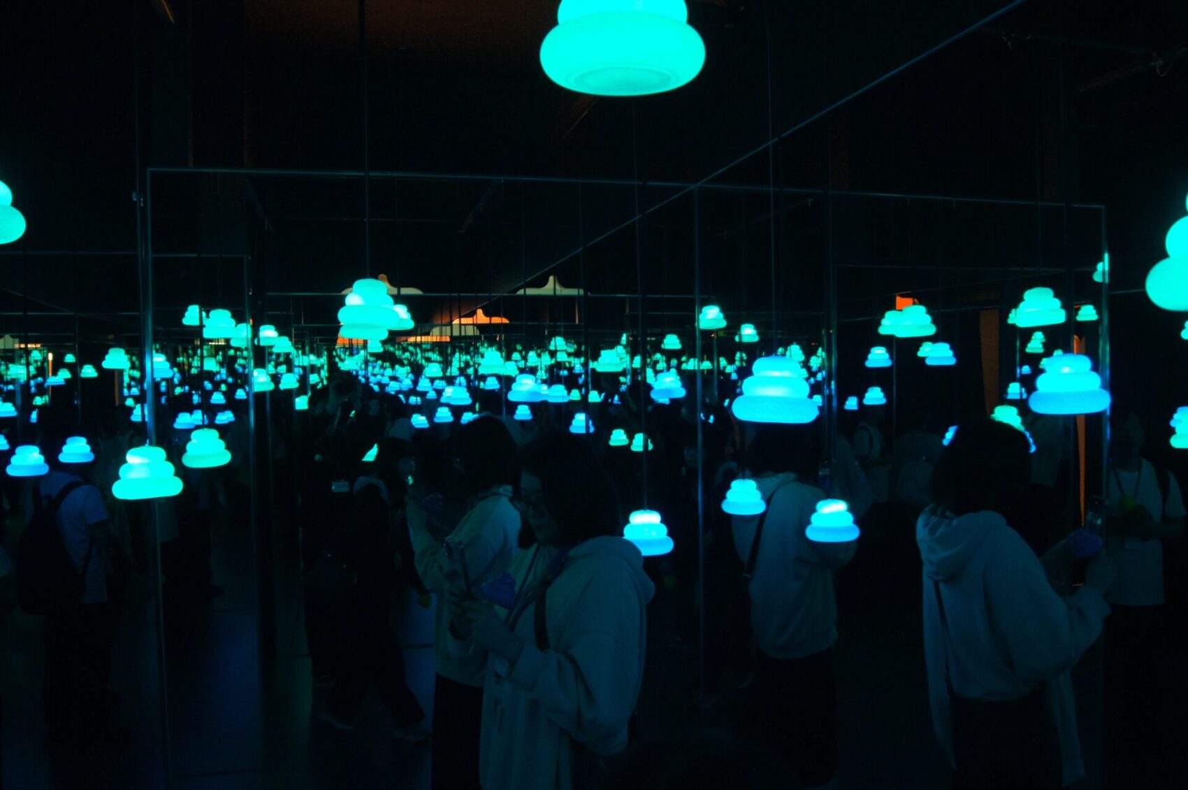左右に並んだ光るうんこが来場者を導く“異世界への通路”。光ファイバーを仕込んだうんこが天井・壁一面にずらりと並びます。足元のネオンが色変化して映えるので、自撮り棒必携です!