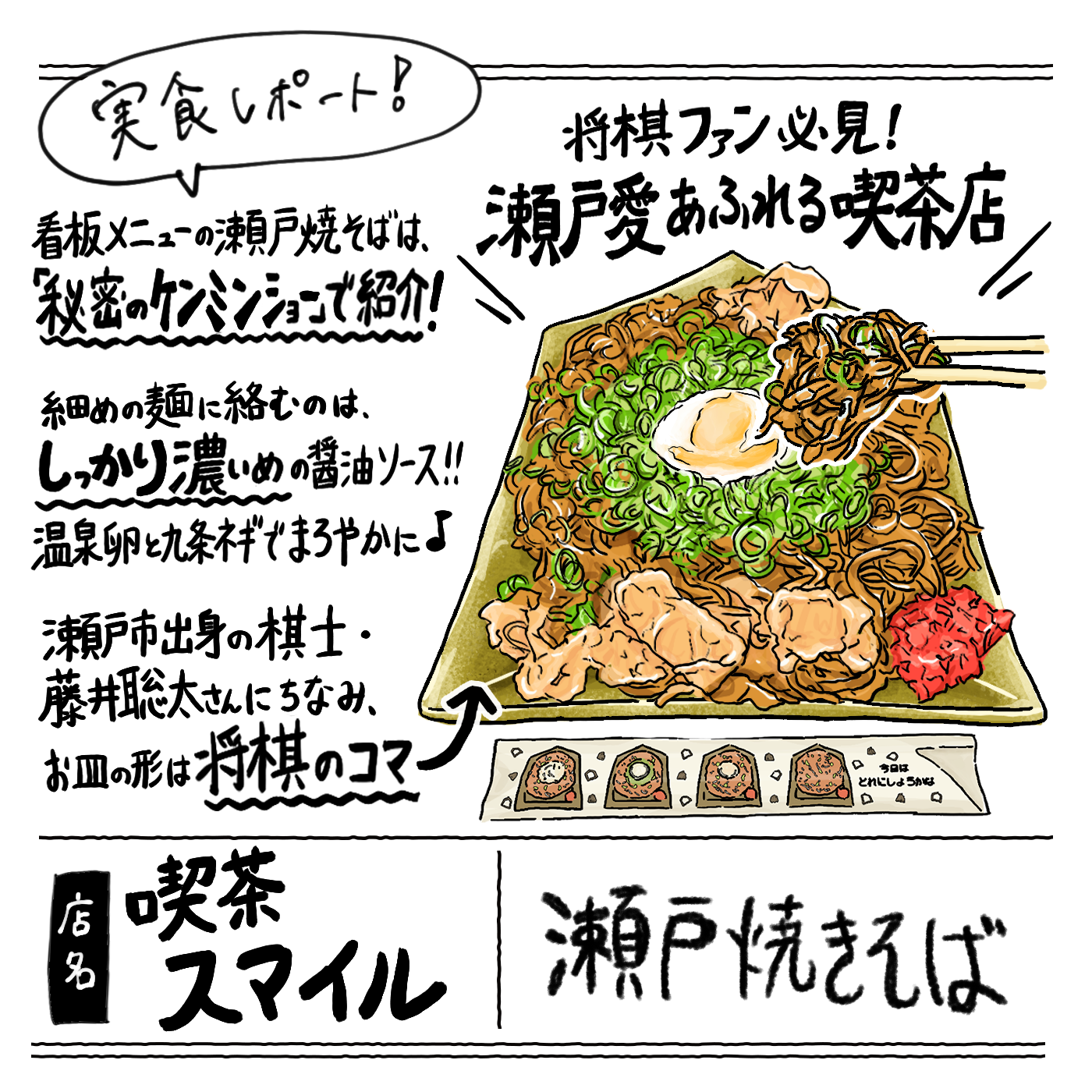 看板メニューは、「秘密のケンミンショー」でも紹介された瀬戸焼きそば。瀬戸市出身の棋士・藤井聡太さんにちなんで将棋のコマの形をしたお皿で提供されます。